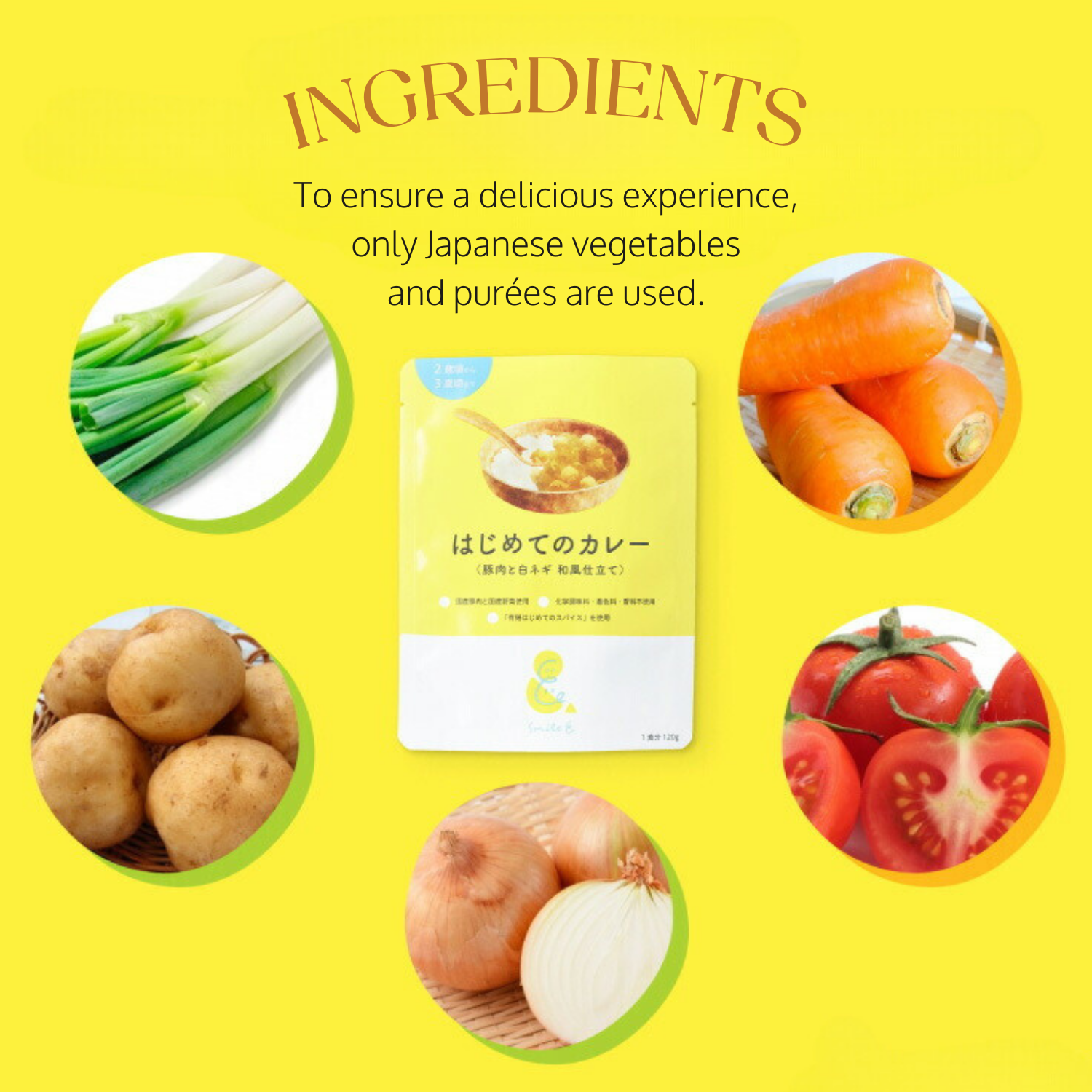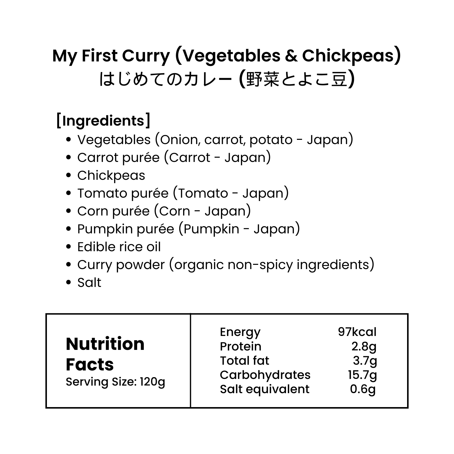 Onion, carrot, potato (Japan), Carrot purée (Carrot - Japan), Chickpeas, Tomato purée (Tomato - Japan), Corn purée (Corn - Japan), Pumpkin purée (Pumpkin - Japan), Edible rice oil, Curry powder, Salt