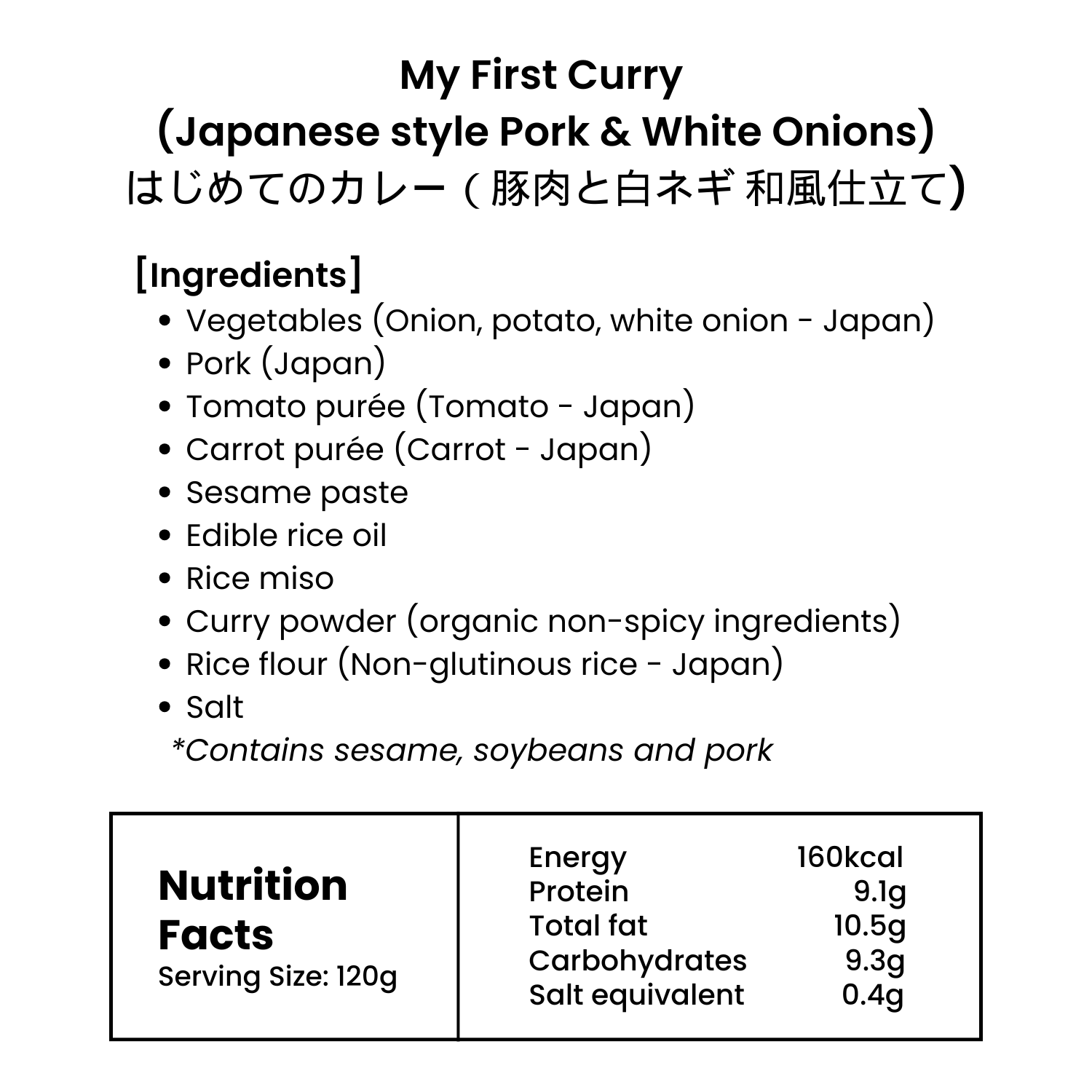 Onion, potato, white onion (Japan), Pork (Japan), Tomato purée (Tomato - Japan), Carrot purée (Carrot - Japan), Sesame paste, Edible rice oil, Rice miso, Curry powder, Rice flour (Non-glutinous rice - Japan), Salt
