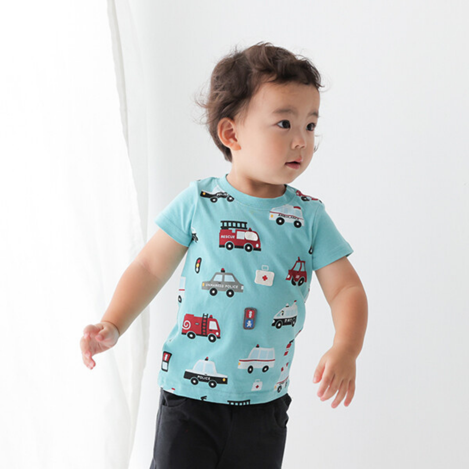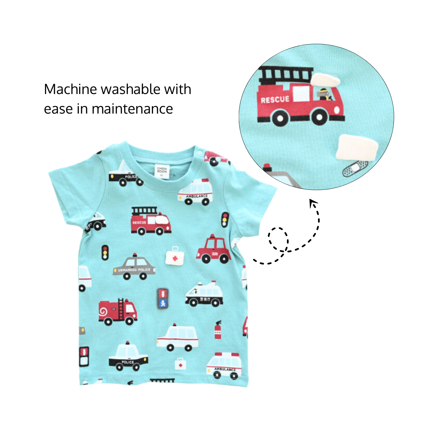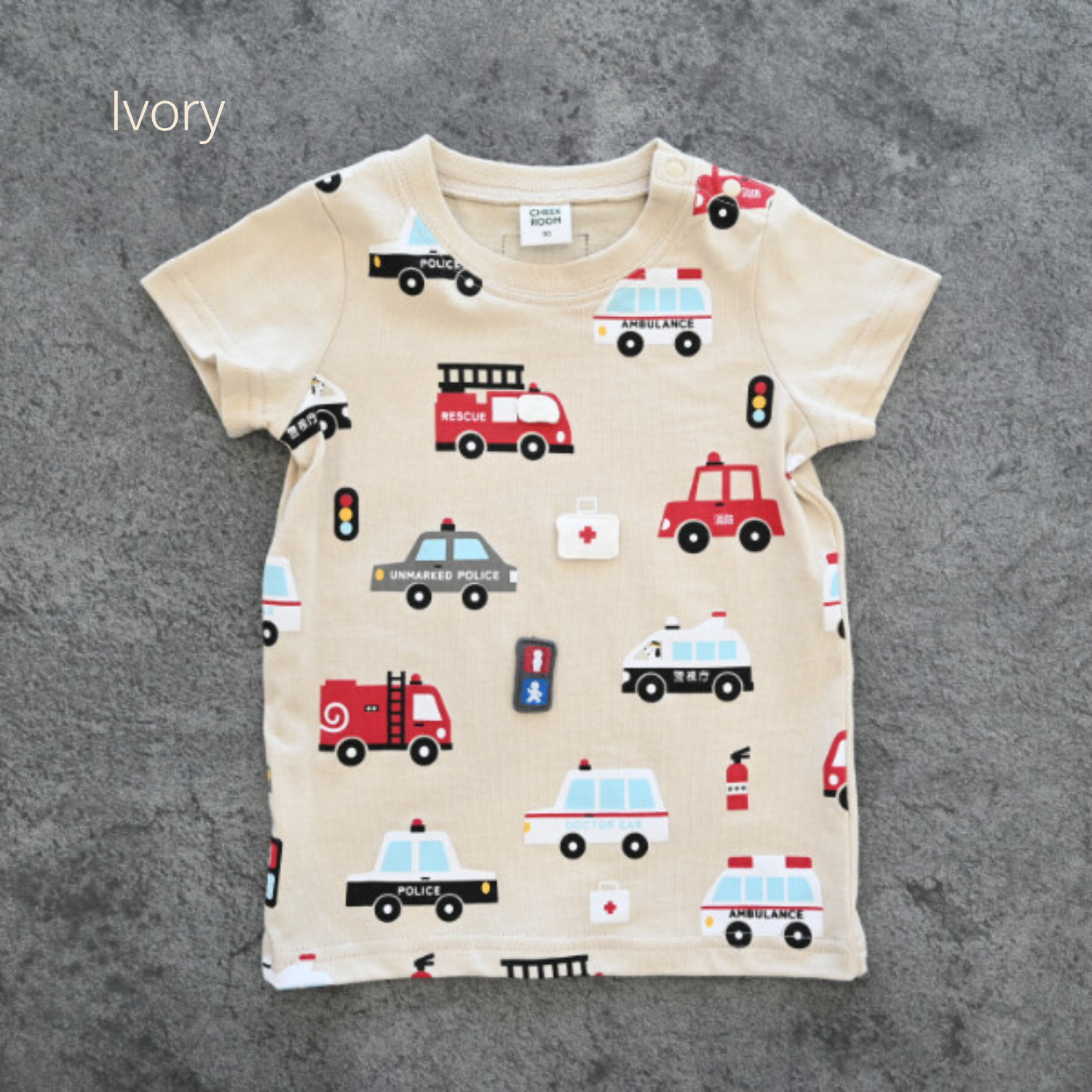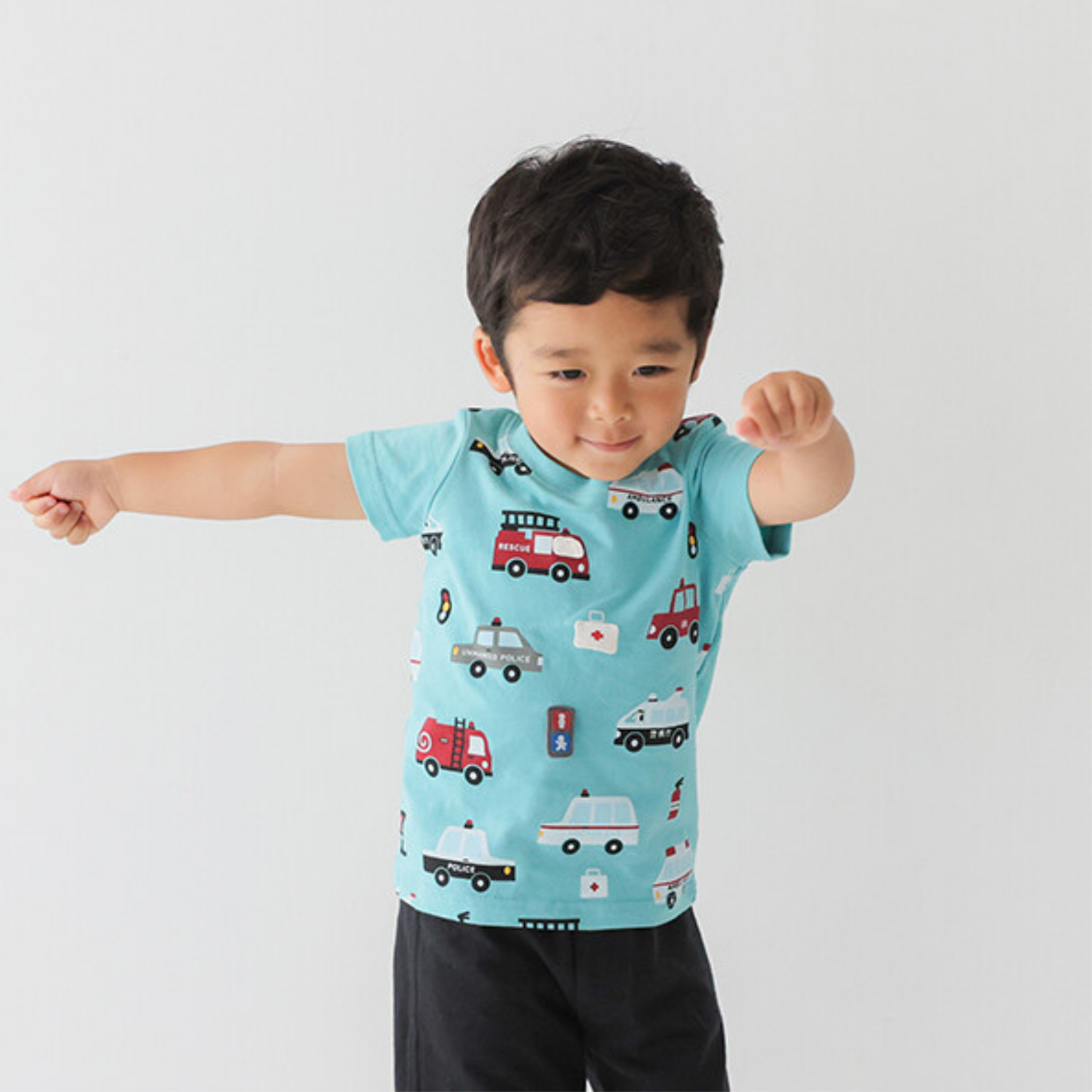 Featuring bold rescue vehicles—fire trucks, ambulances, and police cars—this tee invites little heroes to explore a world of action.
