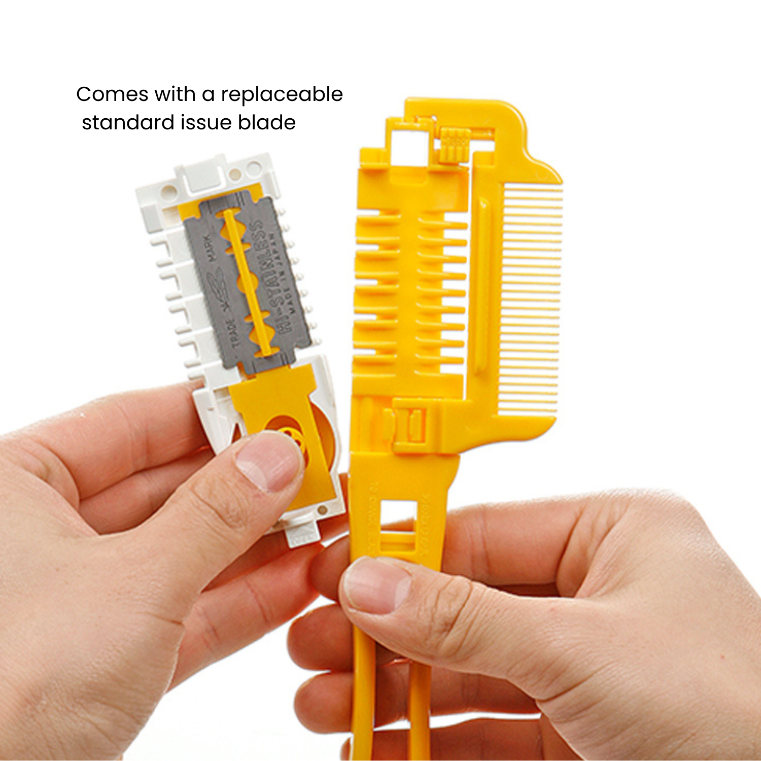 There's a razor hidden between plastic comb teeth, so you will not accidentally hurt your child if he/she makes sudden movements.